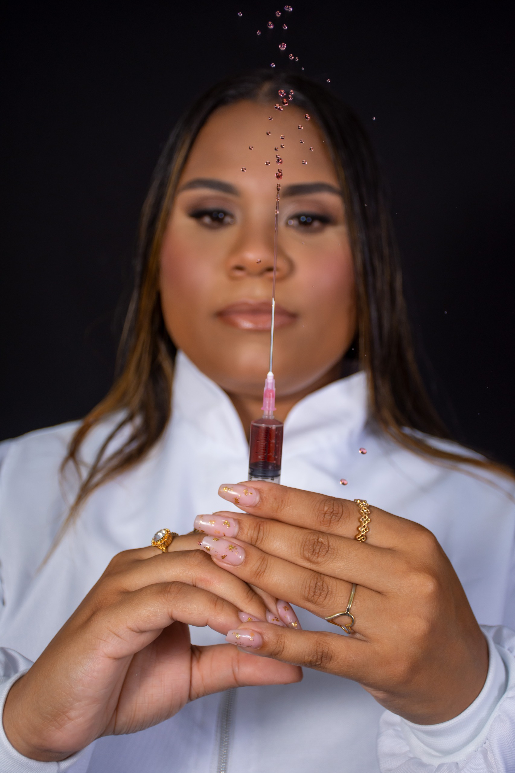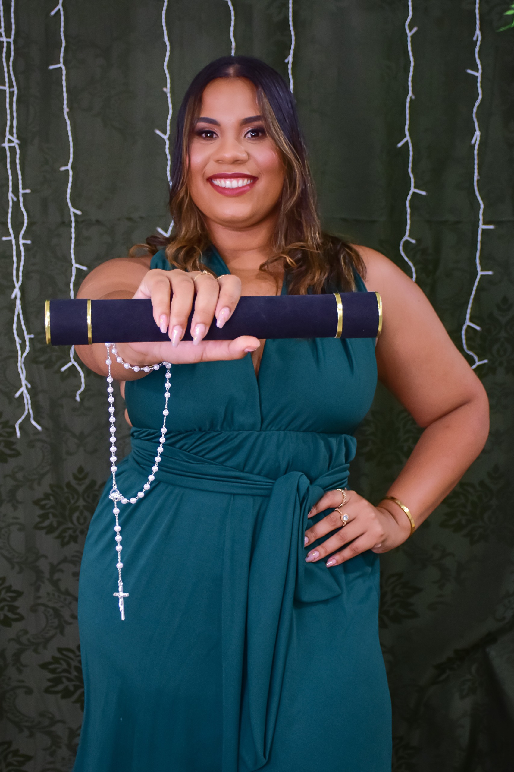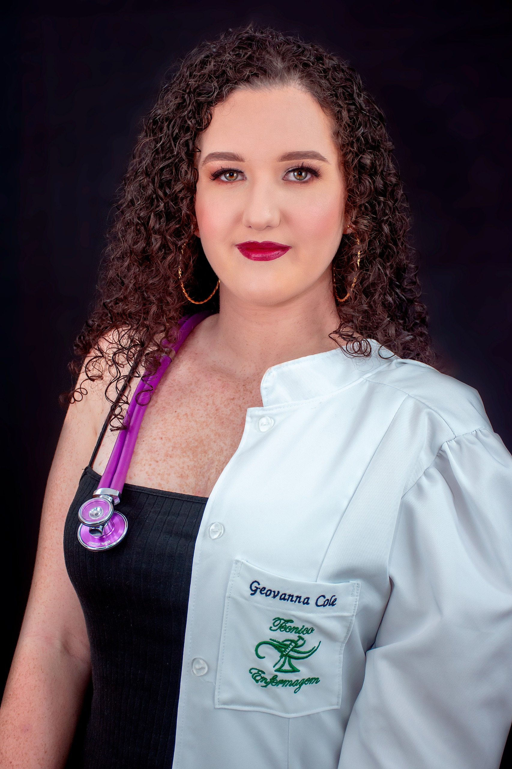 Com beca fornecida pelo estúdio, iluminação profissional e poses personalizadas.
