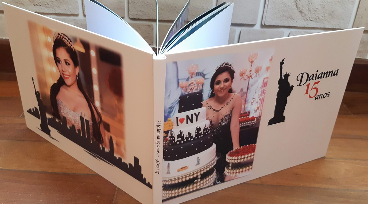 Álbum impresso de alta qualidade no formato 25x50cm, contendo até 120 fotos cuidadosamente selecionadas para contar a história do seu aniversário.